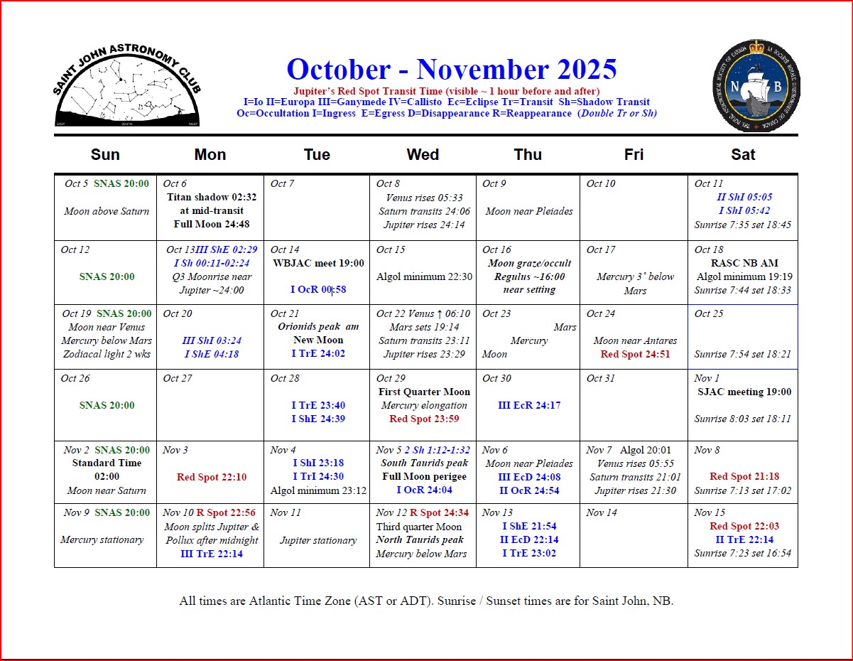 The next meeting of the Saint John Astronomy Club is this Saturday, Nov 1st, 7 pm in the Rockwood Park Interpretation Centre. If anyone wants to borrow a club telescope contact the Equipment Manager via our website.