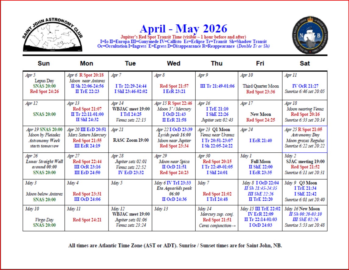 The next meeting of the Saint John Astronomy Club is May 2ed in the Rockwood Park Interpretation Centre