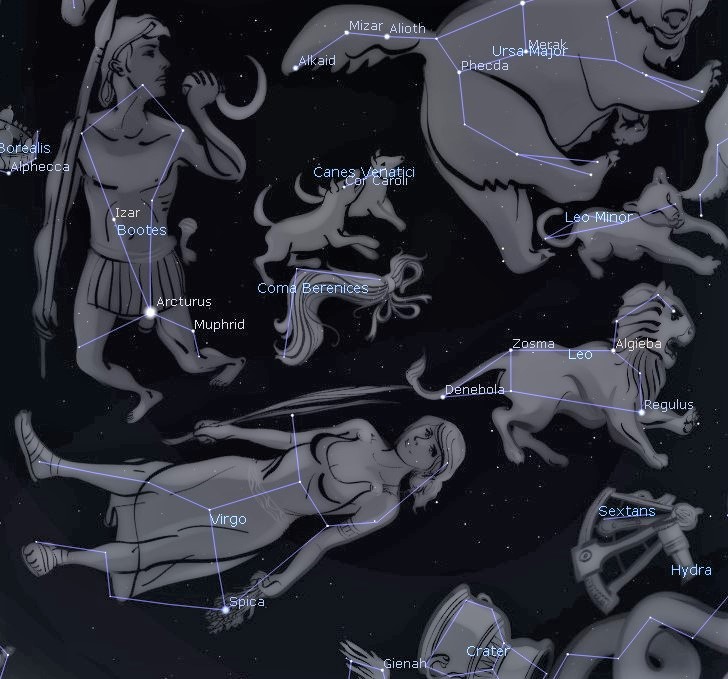 Spica represents an ear of wheat in the hand of Virgo. In Greek mythology she was Demeter, the goddess of wheat or agriculture (Ceres to the Romans). The Sun passes through this constellation in harvest time, and it is in the head of Virgo at the autumnal equinox. Virgo is the second largest of the 88 constellations in terms of area of sky, trailing only Hydra the Water Snake. Coincidentally, it also trails Hydra in the sky, which can be seen stretching below Leo. The constellation is home to 11 Messier objects, second to Sagittarius in this distinction, and all of them are galaxies. Included in this group is M87, the huge galaxy that had the image of its central black hole shadow released four years ago.