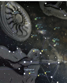 Star formation occurs in clouds of gas and dust within the spiral arms and some can be seen as bright patches with binoculars. Just above the spout of the Teapot is M8, the Lagoon Nebula; and a hint of M20, the Trifid Nebula, can be seen in the same field of view above. Scanning to the left up the Milky Way you encounter M17, the Swan (or Omega) Nebula; and star clusters M16 in the Eagle Nebula and M11, the Wild Duck Cluster. A tour of the Milky Way under a dark sky can keep a binocular stargazer engaged for an evening.