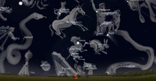 Two of the largest constellations are seen in the southwest and southeast around mid-evening. Eridanus the River flows from Rigel in Orion’s foot to the lower right, and then makes a sharp curve to the left before disappearing below the horizon. It doesn’t end there; it extends at least the same distance southward to terminate at Achernar, the ninth brightest star in the sky. Achernar, of course, means “the river’s end.” The star near Rigel is named Cursa, which means “the footstool.” In terms of square degrees of sky, Eridanus is the sixth largest constellation. It has been associated with many earthly rivers but most often with the Po River in Italy, which the Greeks called Eridanos.