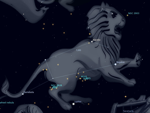 What is the sign of spring for you? The first robin? For stargazers, spring is here when Leo the Lion clears the eastern horizon in twilight. Not only is it a sign of spring, it is a sign of the zodiac; one of the constellations that the Sun appears to travel through as our planet makes its annual orbit. A few thousand years ago the Sun passed in front of the stars of Leo at the height of summer, when the Nile River would rise and eventually flood its banks. Lions would bask at the riverside to escape the heat, and it doesn’t require a huge leap of imagination to see a lion in the stars of this area.