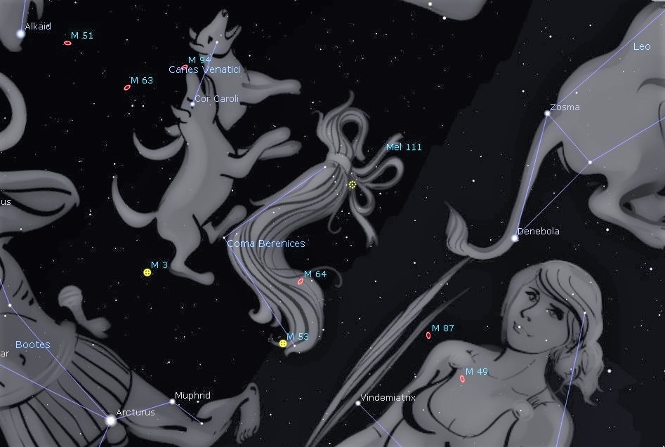 That cluster was the Coma Star Cluster, also called Melotte 111, which can be seen with the naked eye in rural areas and it fills the field of view in binoculars. At one time it was considered to be the tuft of Leo’s tail. The area of sky encompassed by Coma Berenices and its surrounding constellations is called the Realm of the Galaxies. The galactic North Pole lies within this constellation, perpendicular to the dusty disc of our Milky Way Galaxy. When we look in this direction the paucity of interstellar dust allows us to see deeper into space and observe other galaxies tens of millions of light years away. This relatively small constellation contains eight of the 110 Messier objects within its borders, including globular cluster M53 and M64, the Black Eye Galaxy.