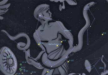 The part of Serpens west of Ophiuchus is called Serpens Caput (meaning head); to the east is Serpens Cauda (for tail). M16 is a star cluster with a rather faint cloud, the Eagle Nebula, within Serpens Cauda. It gained fame as the iconic Pillars of Creation photo from the early years of the Hubble Space Telescope. The delightful globular cluster M5 is found in Serpens Caput, and several other globular clusters reside within the borders of Ophiuchus.