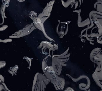 The Summer Triangle is at its highest in early evening. Vega pokes through the twilight overhead, followed by Altair to the south and Deneb to the east. All three are the brightest stars of their respective constellations of Lyra, Aquila and Cygnus. Although it is the dimmest of the trio, Deneb is actually much brighter but it is about 60 times more distant. If it were as close as the other two it would be more than ten times brighter than Venus.