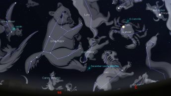 The Moon is at third quarter this Sunday. It near Spica on Christmas morning and the slim crescent rises near Antares next Saturday with Mercury a fist-width to their left. Mercury is at greatest elongation from the Sun on Wednesday, and that evening Venus sets after 8:30 pm followed by Saturn two hours later. On Thursday evening between, 6:25 and 7:00, telescope and binocular users might see Jupiter’s moon Io emerge from the end of a transit, and Ganymede emerge from an eclipse on the opposite side. Mars slowly edges westward against the background stars of Cancer over the week but remains within a binocular view of the Beehive star cluster (also called Praesepe, the Manger) until after Christmas. The minor Ursid shower is at its peak Sunday, with meteors emanating from between the Big Dipper and the North Star.