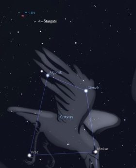 To find M104, imagine a line from the middle of the bottom of Corvus to the upper left star, and extend it not quite that distance. Look in this area for a small arrowhead of three or four stars. This asterism has been called the Stargate. The arrowhead points to a small line of a few stars, which in turn points toward M104 nearby. That line of stars also forms the mouth of an asterism called the Shark, which has a fin and a curved body stretching away from the Stargate. Good luck and wear your Sombrero proudly.