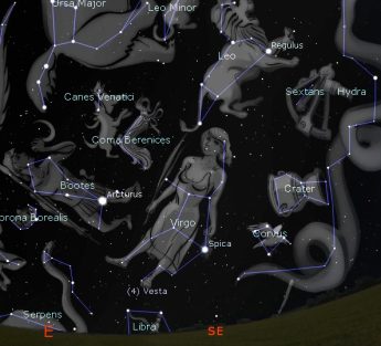As the Sun is setting this week, Spica is rising in the east. This blue giant star is the brightest in the constellation Virgo the Maiden, and the 14th brightest star of the night sky. It is usually located by following the arc of the Big Dipper’s handle to Arcturus and driving a spike to Spica. With Arcturus in Boötes and Regulus in Leo, or dimmer Denebola in Leo’s tail, it forms the Spring Triangle. If you toss in Cor Coroli in Canes Venatici, below the handle of the Big Dipper you get the Spring Diamond.