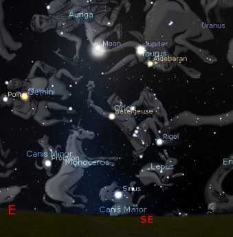 When the Moon is full or nearly so amateur astronomers can get a little grumpy because the moonlight washes out the faint galaxies, nebulae and comets. But this time of year the waxing gibbous Moon can play a role in some imaginative stargazing. On Friday evening it is above Orion, looking like a football approaching his outstretched right hand. Will he catch it in the end zone and be a hero like Perseus, or miss it and be a goat like Capricornus? With the Moon in Taurus on Thursday and in the feet of Gemini next Saturday, we also have a Chicago Bull passing the ball to a Minnesota Twin for an all-star all-sport soccer game. Is that a lacrosse stick in Orion’s hand?