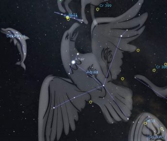 After twilight the bright star Altair is halfway up in the southeastern sky, forming the lower peak of the Summer Triangle with Vega and Deneb. It is flanked by two somewhat dimmer stars, Tarazed and Alshain, and the trio forms the head of Aquila the Eagle. The eagle’s body and tail stretch southward, while the wings reach forward to propel it up the Milky Way. In Greek mythology the eagle was the pet of Zeus and the bearer of his deadly thunderbolts. In Chinese mythology Tchi-Niu (Lyra) was a princess and royal weaver, and Kien-Niou (Aquila) tended the king’s cows. The two fell in love and were married but they subsequently neglected their chores. Angered, the king placed the herder on the opposite side of the river, represented by the Milky Way. On the seventh day of the seventh month all of the magpies in the country form a bridge to allow the lovers to be together for one day.