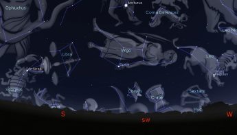 Regulus in Leo and Antares in Scorpius were two of the Royal Stars, and we see them now appearing through evening twilight. Regulus guarded the north and marked the summer solstice, while Antares guarded the west and marked the beginning of autumn. Fomalhaut, in Piscis Austrinus below Aquarius, guarded the south and marked the winter solstice. Aldebaran, currently rising in Taurus half an hour before sunrise, guarded the east and marked the spring equinox. These stars no longer mark the seasons as they did 5000 years ago due to precession of Earth’s polar axis, which makes one complete wobble every 25,800 years. On the summer solstice, the Sun is now located near the border of Gemini and Taurus.