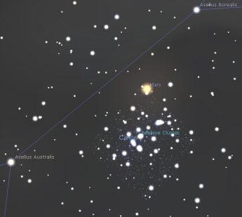 The Moon rides above Mars this Saturday evening to highlight Astronomy Day, and it is at first quarter on Sunday with the Lunar X being visible around 9 pm. The Moon is near Regulus on Monday and Spica on Friday. Mars is within a binocular view of the Beehive star cluster all week, passing through the upper portion over the first few evenings. Jupiter is still in good position for twilight observing between the horns of Taurus, setting around 11:30 midweek. Saturn is within a wide binocular view of bright Venus in early morning all week, while Mercury is lost in the twilight glow. The Eta Aquariid meteor shower peaks this Tuesday morning, with the radiant rising in the east around 3 am.