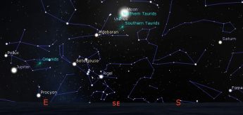 The Moon is full and at perigee on Wednesday, making this the closest full Moon of the year. Expect extreme tides near the end of the week. The Moon is near Saturn on Sunday and near the Pleiades Thursday. This weekend Mercury is low in the southwest, setting about 59 minutes after sunset, with Mars two binocular widths to its right. Mercury would be difficult to see with binoculars, Mars is much dimmer. Saturn is highest and best for observing around 9:30 pm midweek, and Jupiter rises below the Gemini Twins a half hour later. Venus rises in Virgo to the lower left of Spica at 5:50 am midweek, when Jupiter is at its highest to the south. Binocular comet 2025 A6 Lemmon will be dimming and getting lower as it moves across the bottom of Ophiuchus over the week. See the Heavens Above website for its location at any time. The South Taurid meteor shower peaks on Wednesday, one week before the North Taurids, but bright moonlight will make meteor observing difficult,