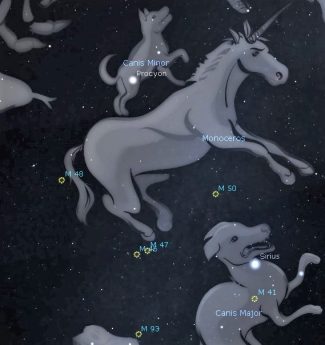 Monoceros is a constellation that is easy to locate, sandwiched between Orion’s dogs Canis Major and Canis Minor, but it is not easy to see. From urban areas its dim stars are as elusive as the unicorn they depict. It was one of eight new constellations created on a globe by the Dutch cartographer Petrus Plancius around 1612. Of those eight, only Monoceros and Camelopardalis are recognized as official constellations today. Monoceros is situated within the winter Milky Way, which is apparent in rural skies.