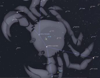 The most inconspicuous of the zodiac constellations is faint Cancer the Crab, which is nestled between Gemini and Leo. In mythology, the crab was sent by the goddess queen Hera to distract Hercules while he was battling the Hydra. The crab was no match for the strongman’s stomp. Ancient Egyptians saw it as their sacred dung beetle, the scarab. In the first millennium BCE the Sun was in Cancer at the summer solstice, the time when it halts its northward motion and slowly starts heading south. This back and forth motion of the rising and setting Sun on the horizon was perhaps reminiscent of a crab sidling on a beach. The summer Sun is now situated in Taurus near the constellation border with Gemini.