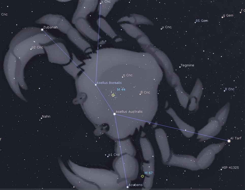 Cancer is recognized by a trapezoid of dim naked eye stars as the crab’s body, with a couple of other stars representing the claws. The four stars were also seen as a manger flanked by a pair of donkeys, Asellus Borealis and Asellus Australis. On a clear dark night we can see a hazy patch of hay within the manger, and binoculars reveal it as a beautiful star cluster called the Beehive, Praesepe or M44. Being near the ecliptic, the planets often pass through or near this cluster, masquerading as a bright guest star. The Beehive was once used to forecast storms, for if it could not be seen it was hidden by light clouds at the front of a weather system. Binoculars can reveal another star cluster, number 67 on the Messier list of fuzzy non-comets, less than a fist-width south of M44.