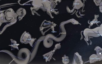 The constellation Hydra is the largest of the 88 and it represents a female water snake. I mention the gender because there is a male water snake constellation, Hydrus, in the southern hemisphere. A small trapezoid of stars, located about halfway below a line between Procyon in Canis Minor and Regulus in Leo, represents the snake’s head. To its lower left is a solitary bright star called Alphard, the heart of the snake. The rest of the constellation is a long serpentine string of fainter stars that stretches to Virgo. It takes about eight hours for the entire constellation to rise. Two other constellations, Corvus the Crow and Crater the Cup, are sitting on Hydra’s back.