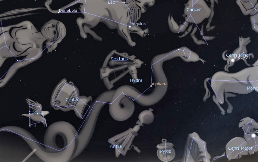The constellation Hydra is the largest of the 88 and it represents a female water snake. I mention the gender because there is a male water snake constellation, Hydrus, in the southern hemisphere. A small trapezoid of stars, located about halfway below a line between Procyon in Canis Minor and Regulus in Leo, represents the snake’s head. To its lower left is a solitary bright star called Alphard, the heart of the snake. The rest of the constellation is a long serpentine string of fainter stars that stretches to Virgo. It takes about eight hours for the entire constellation to rise. Two other constellations, Corvus the Crow and Crater the Cup, are sitting on Hydra’s back.