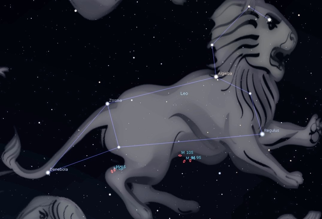 I regard Leo the Lion as the signature constellation of spring, and it is not difficult to picture a lion in its distinctive pair of asterisms. A backwards question mark or a sickle represents its chest and mane, anchored by the bright star Regulus at its heart or front leg. To the east a triangle of stars forms the back leg and tail. Originally, a faint naked-eye cluster of stars represented a tuft at the end of the tail, but that now makes the tresses of the constellation Coma Berenices.